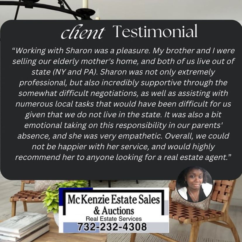 Born and raised in Brooklyn, New York and a resident of Beachwood New Jersey for over ten years, I began my real estate career and eager to meet you. I am the owner of McKenzie Estate Sales & Auctions LLC. This estate sale service provides a key role in the real estate relationship. Additional, I am a former high school speech improvement teacher with a Master’s in Education, I use an educational approach with my clients, ensuring they fully understand the homes they’re viewing and each step of the purchasing and selling process.